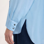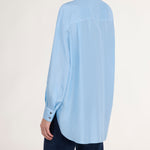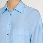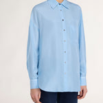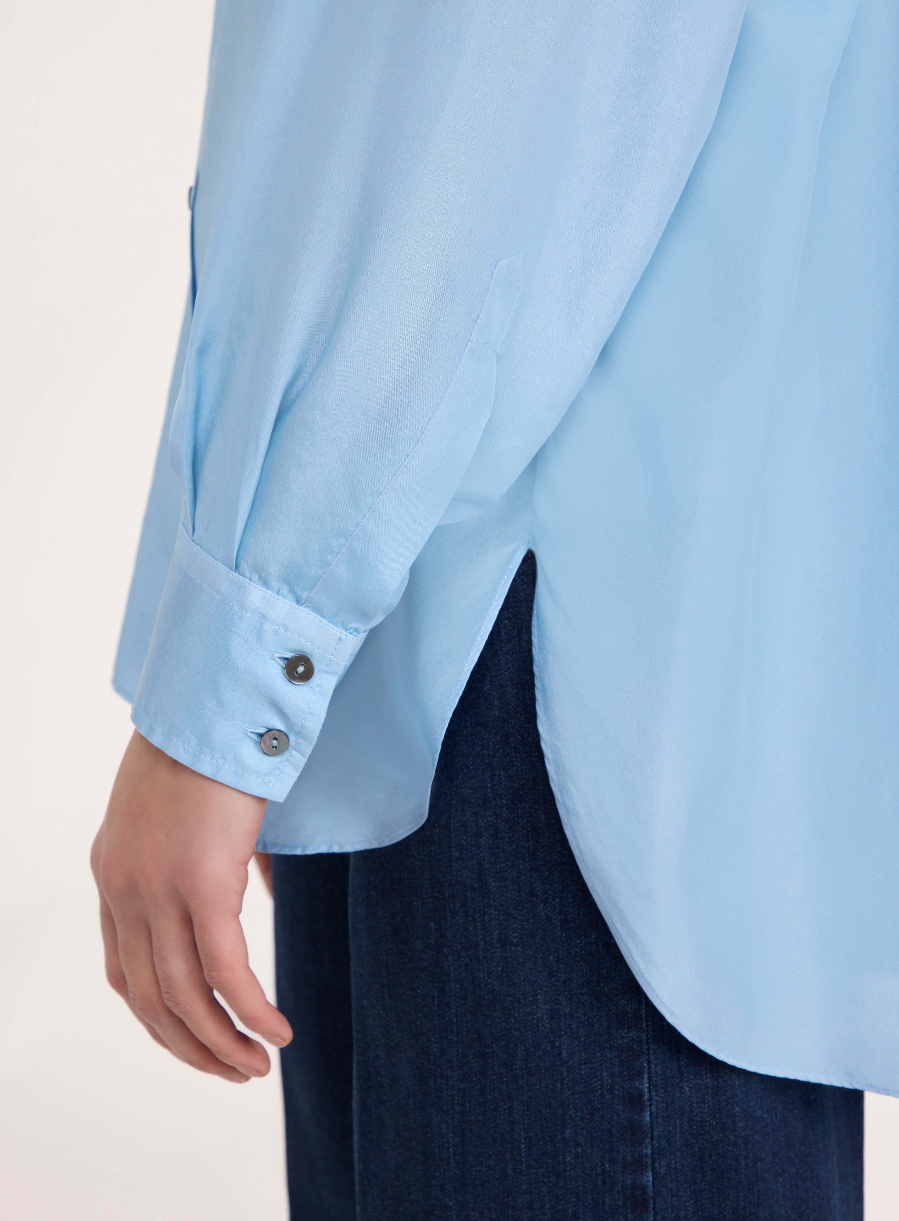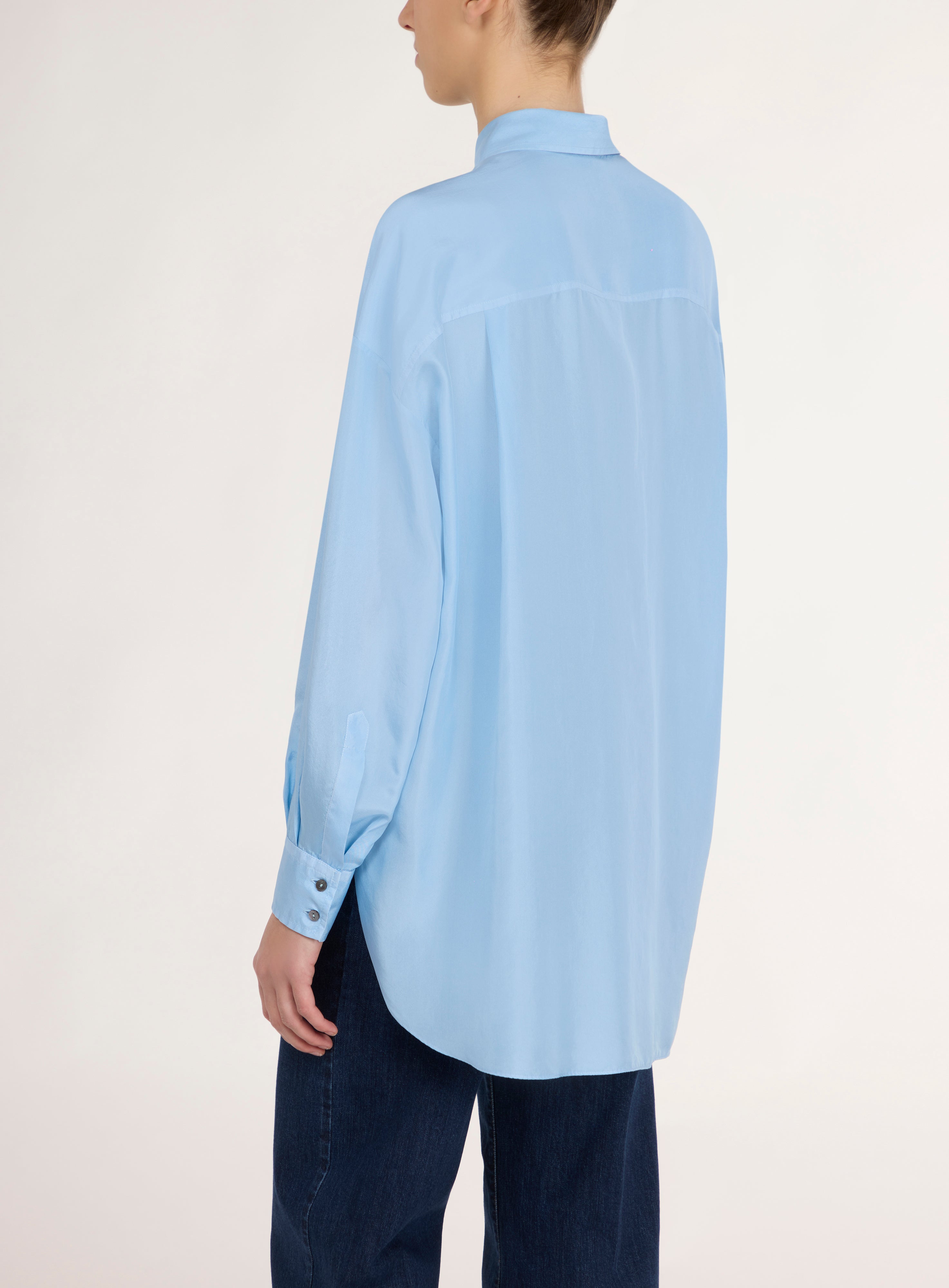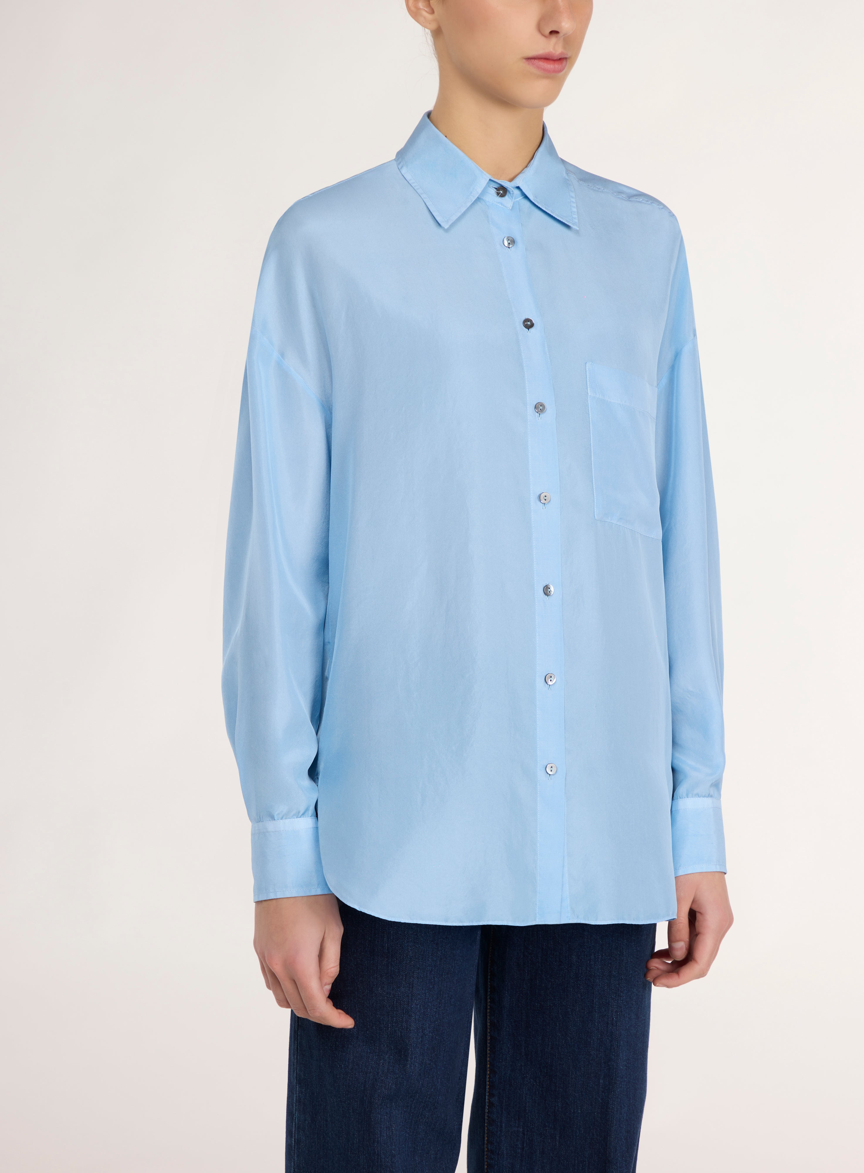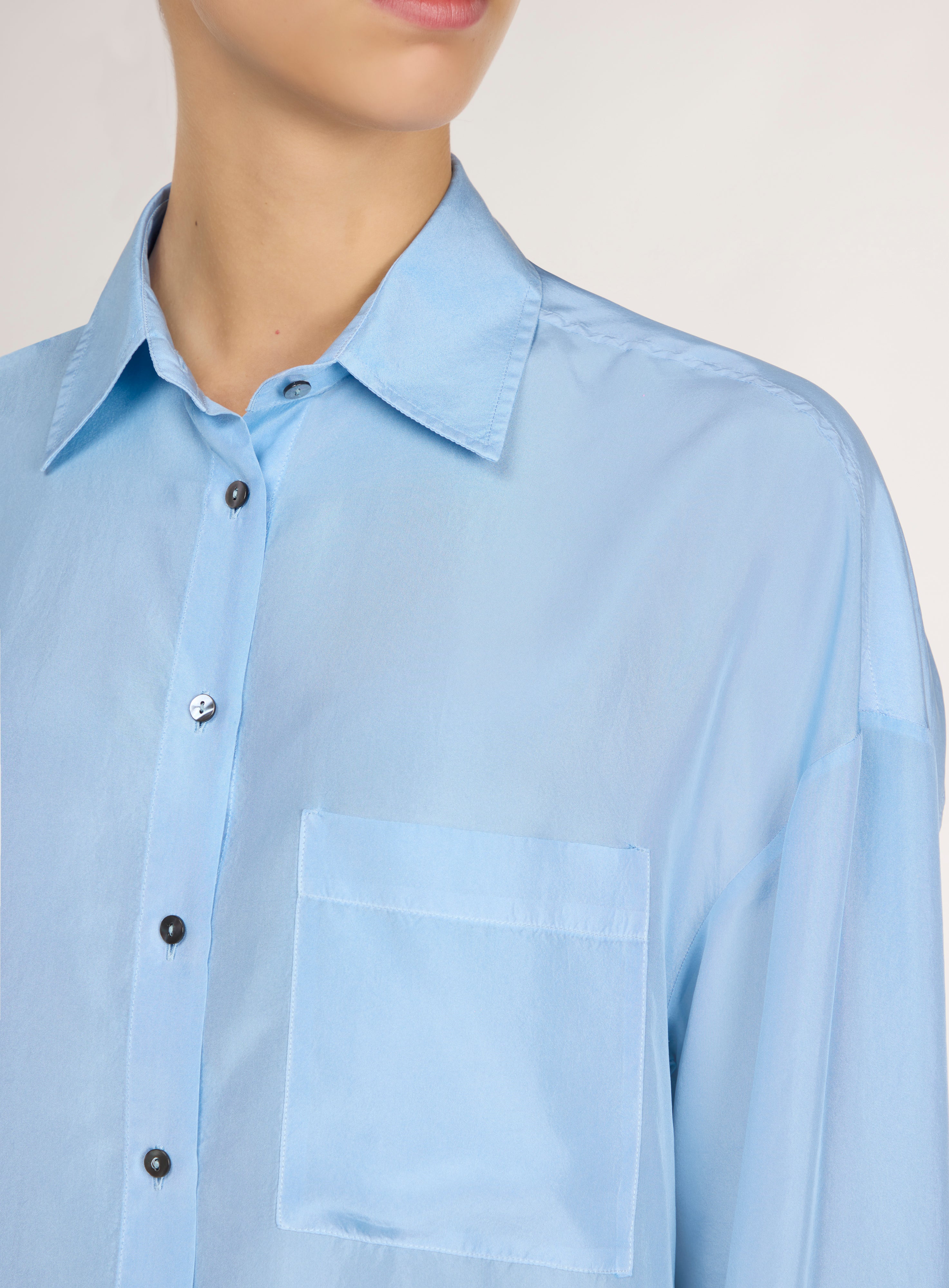 Light blue silk shirt.