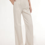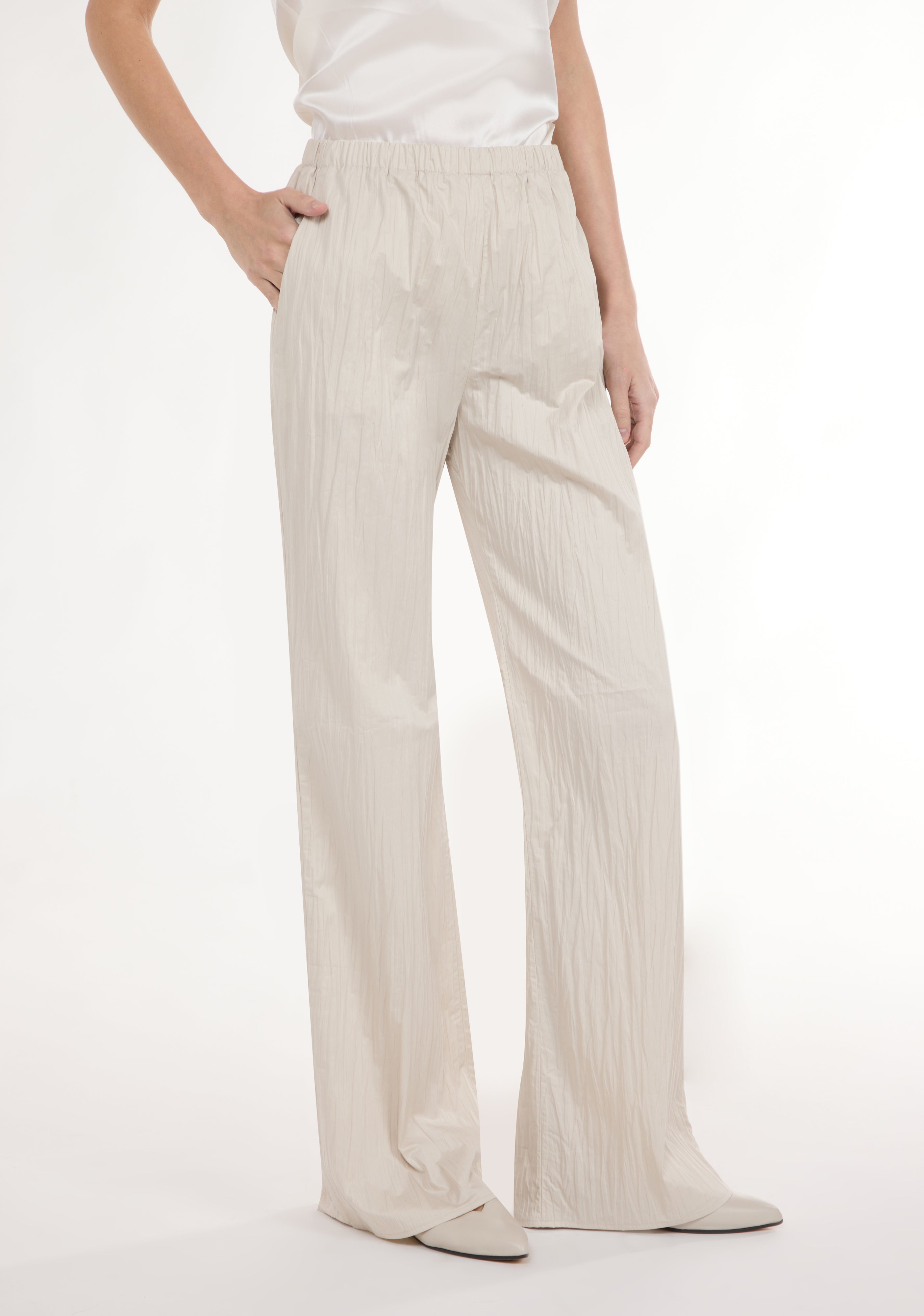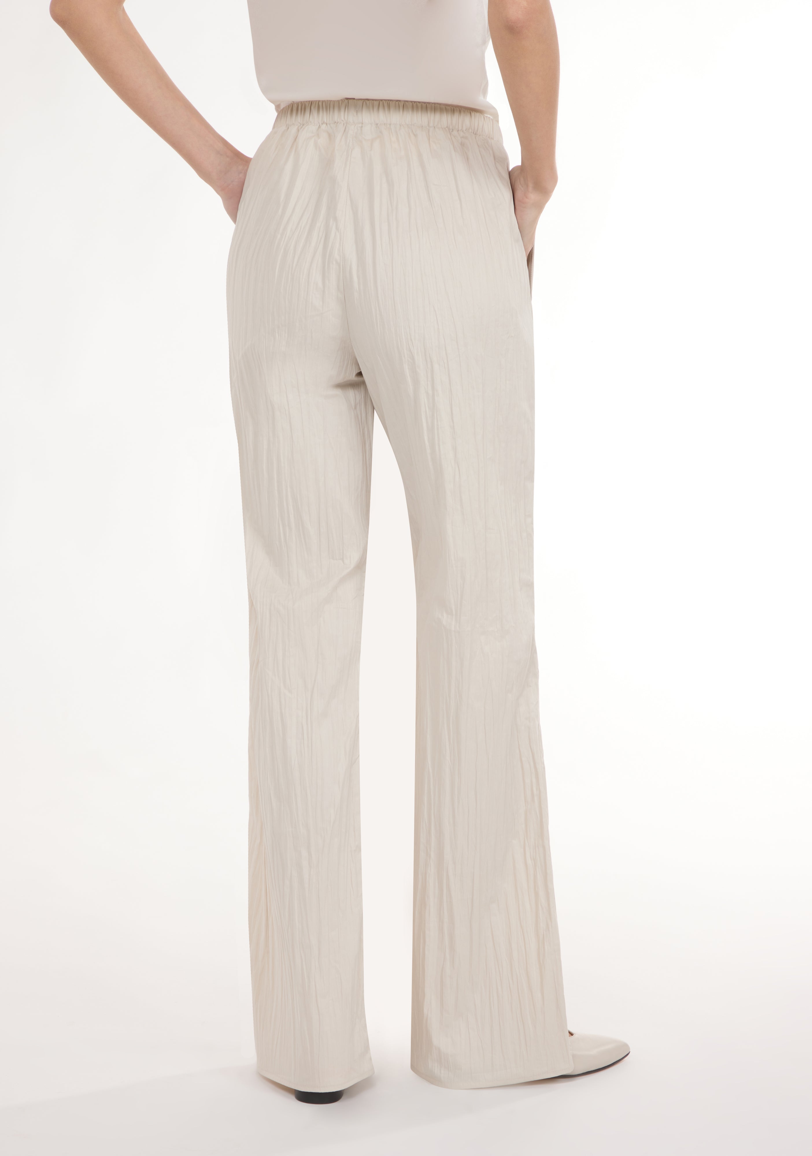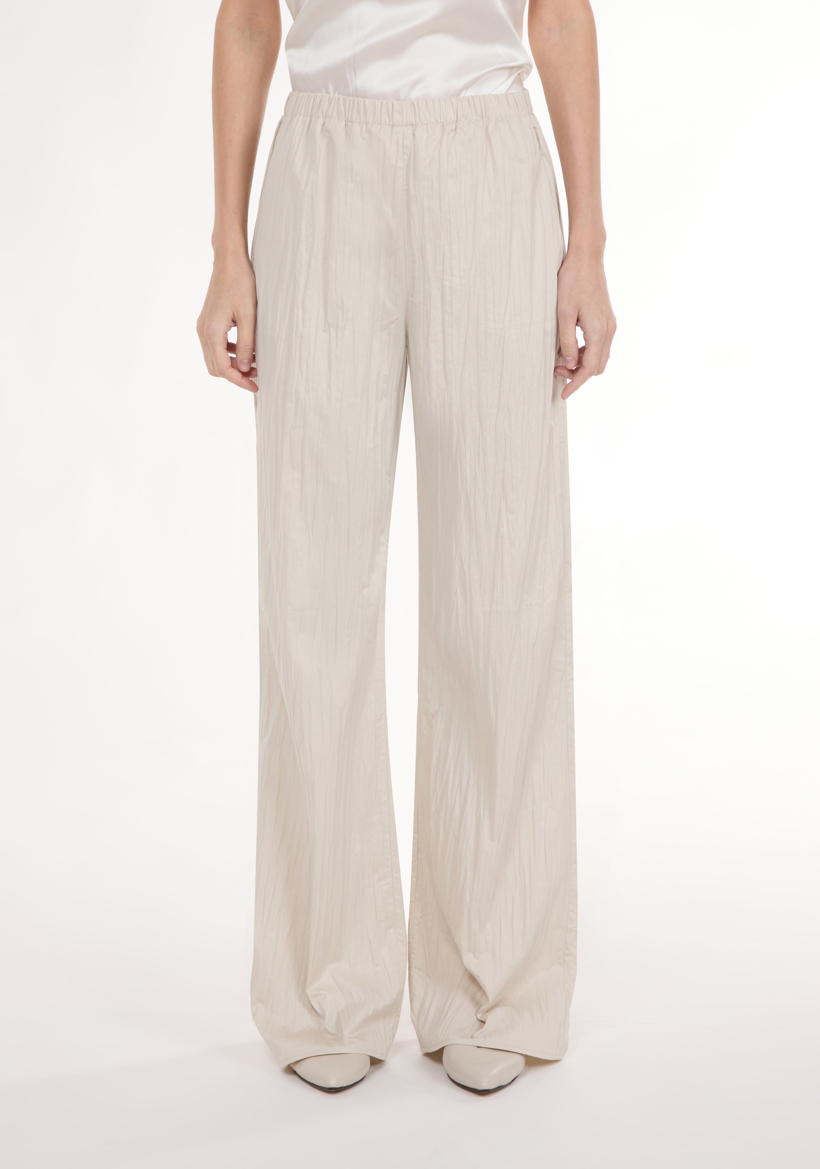 Straight leg trousers with elastic waistband.
